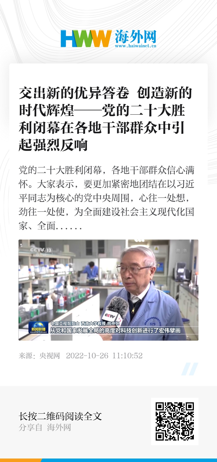 中国工程院院士 西南大学教授 向仲怀:国家有力量,我们有信心,总书记掌舵领航,从党和国家发展全局的高度对科技创新进行了宏伟擘画,我们将全力以赴,以国家战略需求为导向,集聚力量进行原创性引领性科技攻关,坚决打赢关键核心技术攻坚战,奋力在新征程上展现新作为。