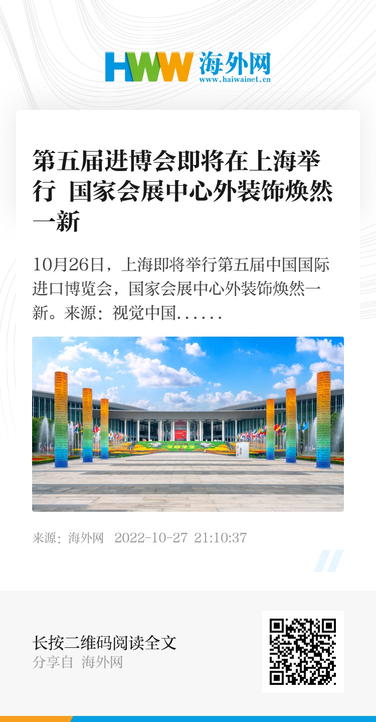 32504488,.第五届进博会即将在上海举行 国家会展中心外装饰焕然一新,.2022-10-27 21:25:37,.204428,.张青津