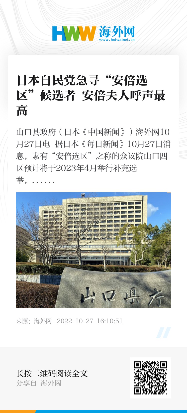 10月15日,安倍夫人昭惠在安倍的老家山口县发言称,丈夫生前非常喜欢山口县,自己也想为此地贡献一份力量。多位安倍派议员表示,按昭惠的发言来看,她很可能将参与山口四区选举。而且,她是“无论是谁也会接受的有力候选者”。