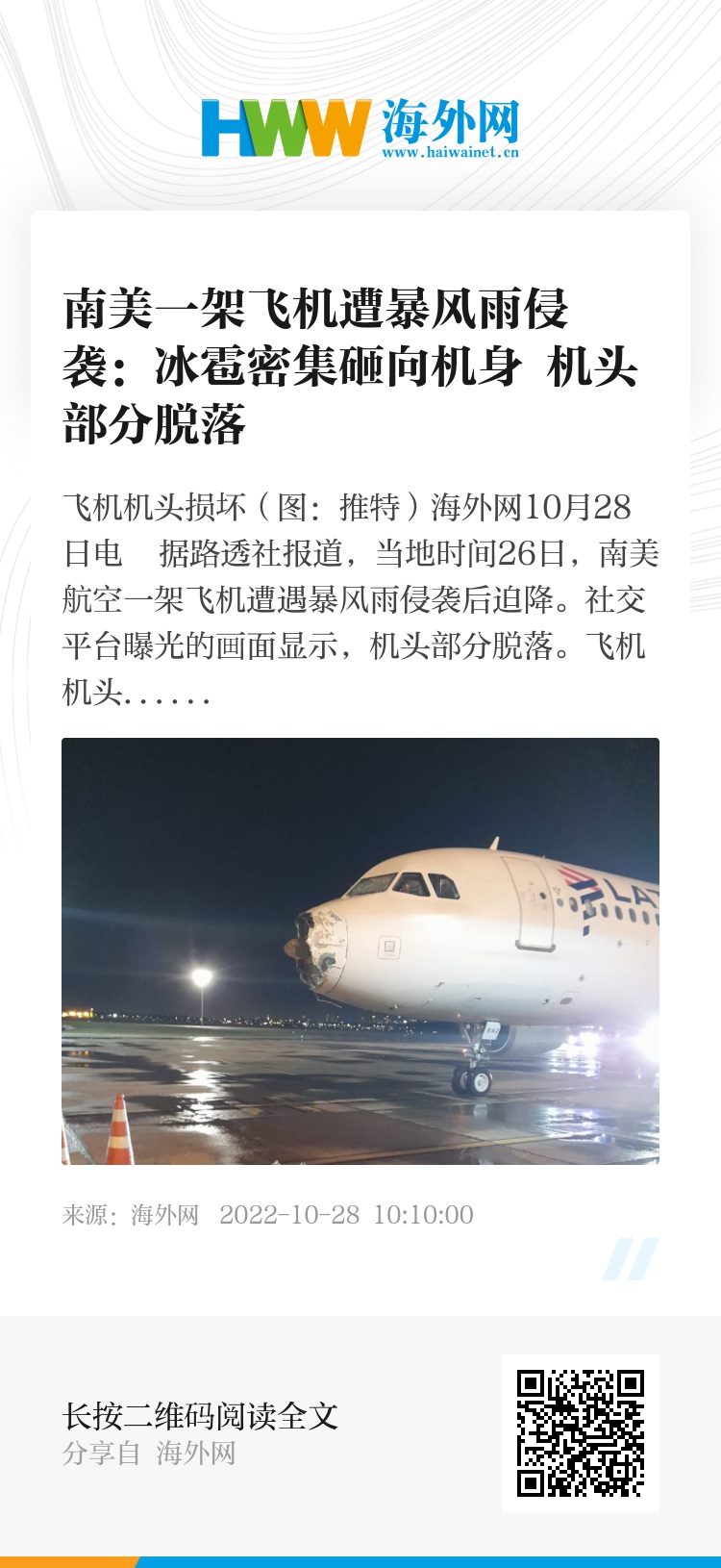 海外网10月28日电 据路透社报道,当地时间26日,南美航空一架飞机遭遇暴风雨侵袭后迫降。社交平台曝光的画面显示,机头部分脱落。