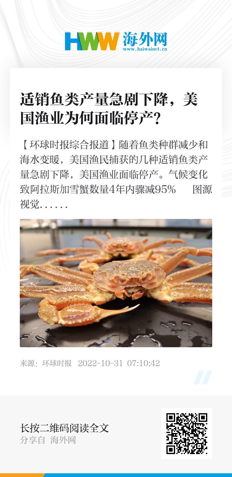 据“美国之音”29日报道,近年来,不断变化的生存环境让鱼类很难从多年的过度捕捞中恢复过来。阿拉斯加州政府禁止秋季捕捞红帝王蟹、冬季捕捞雪蟹,这对白令海螃蟹产业造成严重打击。该地螃蟹产业每年可创收2亿美元。因近年来海水变暖,产量已有所下降。大西洋鳕鱼产业曾是新英格兰地区的支柱产业,现在已基本关停。