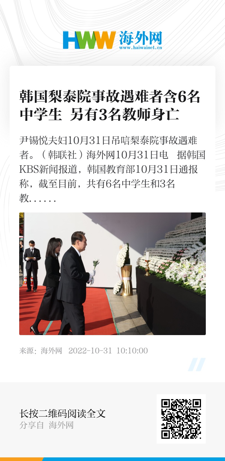海外网10月31日电 据韩国KBS新闻报道,韩国教育部10月31日通报称,截至目前,共有6名中学生和3名教师在梨泰院踩踏事故中遇难。遇难学生包括1名初中生和5名高中生,均在首尔就读。遇难教师分别就职于京畿道、首尔和蔚山市。