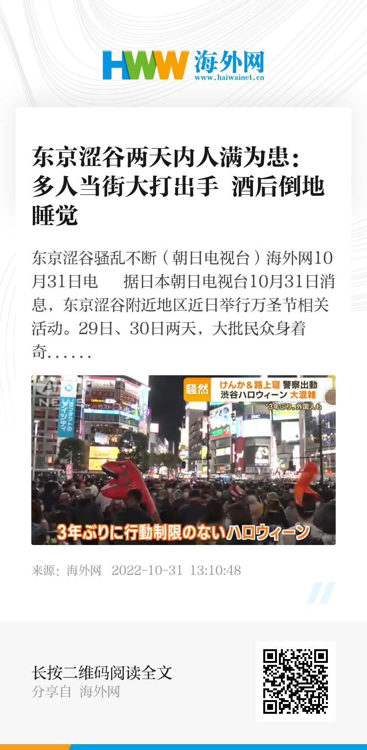 朝日电视台在万圣节前的周末赴涩谷街头采访。这是涩谷时隔3年再次举办没有防疫限制的万圣节活动,街头人满为患,嘈杂吵闹,人们身着奇装异服来回穿梭,还有许多外国人的身影。朝日电视台称,“当街打架的人、躺倒路边的人、跟着大音量音乐跳舞的人......街上骚乱不断。”