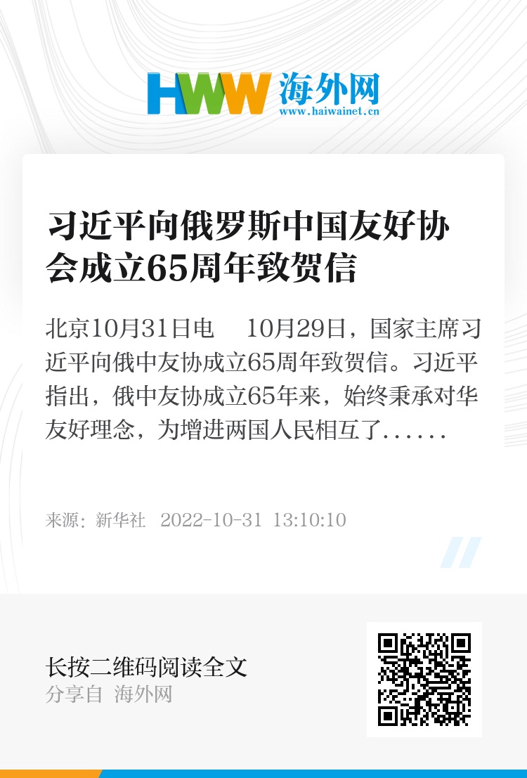 新华社北京10月31日电 10月29日,国家主席习近平向俄中友协成立65周年致贺信。