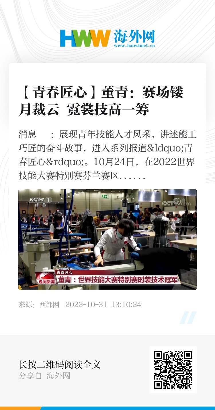 央视网消息:展现青年技能人才风采,讲述能工巧匠的奋斗故事,进入系列报道“青春匠心”。10月24日,在2022世界技能大赛特别赛芬兰赛区,来自湖南工艺美术职业学院的23岁青年教师董青技高一筹,从20个国家和地区的选手中脱颖而出,斩获时装技术项目金牌,实现我国在世界技能大赛时装技术项目上的“三连冠”。