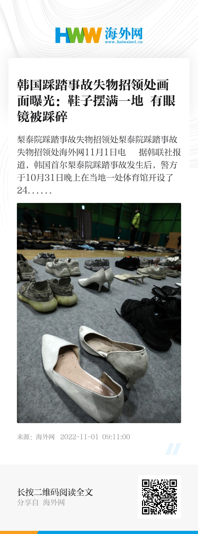 海外网11月1日电 据韩联社报道,韩国首尔梨泰院踩踏事故发生后,警方于10月31日晚上在当地一处体育馆开设了24小时失物招领处,计划运营至11月6日。