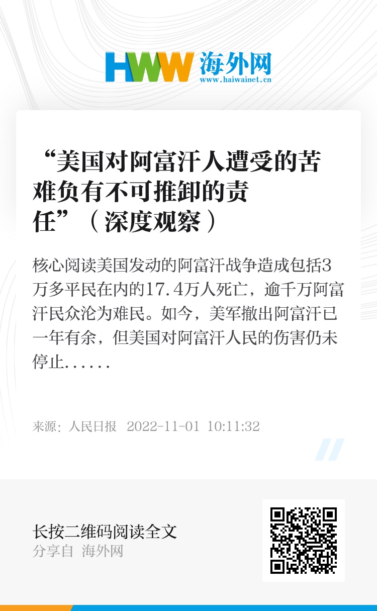 “阿富汗人共创美好未来”组织联合创始人阿拉什·阿奇扎达撰文称:“美国对阿富汗人遭受的苦难负有不可推卸的责任,现在却对战争的恶果视而不见。”美国威尔逊中心南亚问题专家迈克尔·库格尔曼表示:“让我感到震惊的是,华盛顿的许多人似乎热衷于从根本上把阿富汗问题抛在脑后。”俄罗斯驻美国大使馆相关人士表示,美国政府必须承认其在阿富汗失败的军事行动给阿富汗带来的只有痛苦,以及渺茫希望的破灭。美军撤出阿富汗一年多后,人道主义灾难正在阿富汗蔓延,这可能比阿富汗战争本身更加致命。(记者 李志伟)