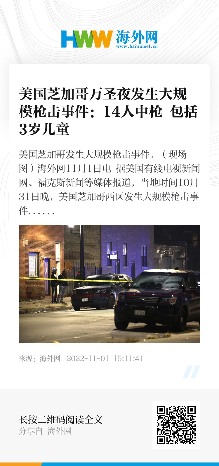 海外网11月1日电 据美国有线电视新闻网、福克斯新闻等媒体报道,当地时间10月31日晚,美国芝加哥西区发生大规模枪击事件,造成至少14人受伤,其中包括数名儿童,最小的年仅3岁。
