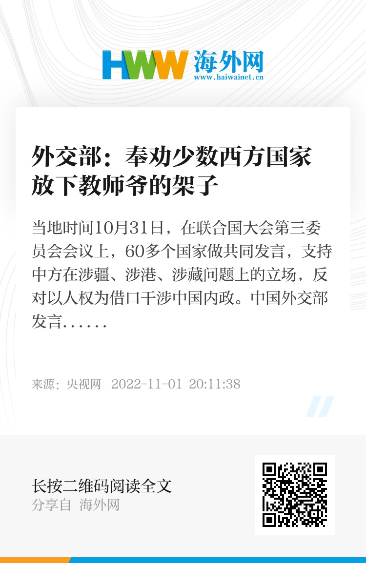 联大三委是对话合作的平台,不是分裂对抗的角斗场。少数西方国家大搞人权问题政治化和双重标准的拙劣表演,世人早已看清看腻了。我们奉劝少数西方国家放下教师爷的架子,停止借口人权问题搞政治操弄、造谣抹黑和遏制打压。它们应该做的,是深刻反省自身存在的严重侵犯人权问题,深刻检讨给他国制造的人权灾难,回到合作对话的正确轨道上来。