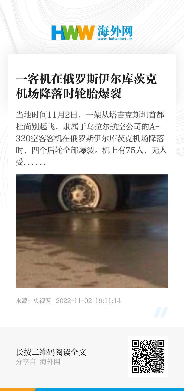 当地时间11月2日,一架从塔吉克斯坦首都杜尚别起飞,隶属于乌拉尔航空公司的A-320空客客机在俄罗斯伊尔库茨克机场降落时,四个后轮全部爆裂。机上有75人,无人受伤。