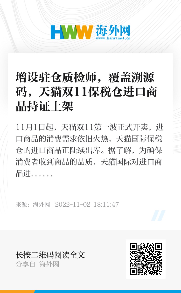 据了解,为确保消费者收到商品的品质,天猫国际对进口商品进行了全链路质检,实现溯源码的全覆盖,今年双11,进口商品需持证才能上架出库。