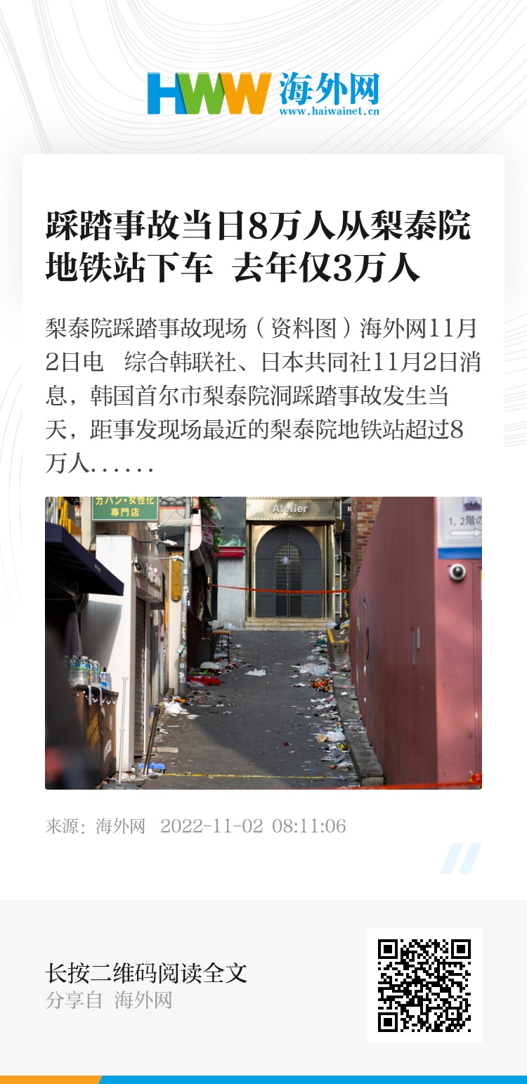 海外网11月2日电 综合韩联社、日本共同社11月2日消息,韩国首尔市梨泰院洞踩踏事故发生当天,距事发现场最近的梨泰院地铁站超过8万人下车,比2021年同期多出2.6倍,2021年仅3万人。