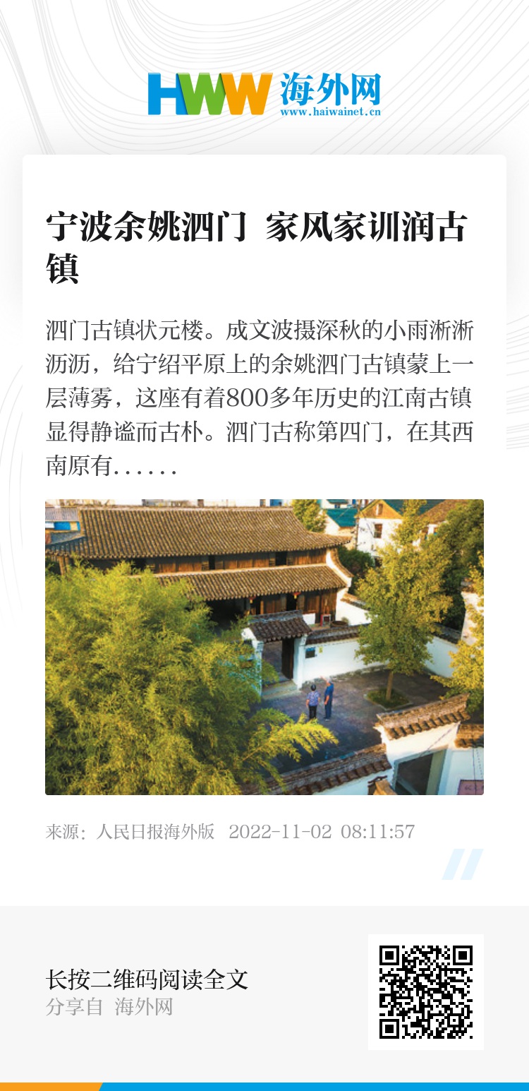 这座浙东古镇是古老的,有着800多年建镇历史;它也是崭新的,走进泗门镇海南村,村民家门口挂着的一块块家风家训牌格外引人注目,“百善孝为先,常存仁善心”“人和方可亲,家和万事兴”“吃不穷,穿不穷,人不读书一世穷”“勿以恶小而为之,勿以善小而不为”等,牌子上写的多数是每户村民立身处世、以德持家的警句。