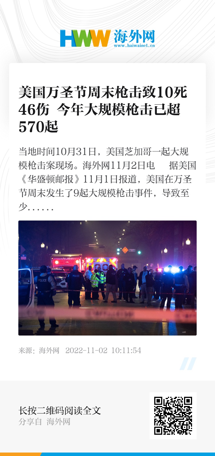 海外网11月2日电 据美国《华盛顿邮报》11月1日报道,美国在万圣节周末发生了9起大规模枪击事件,导致至少10人死亡,46人受伤。
