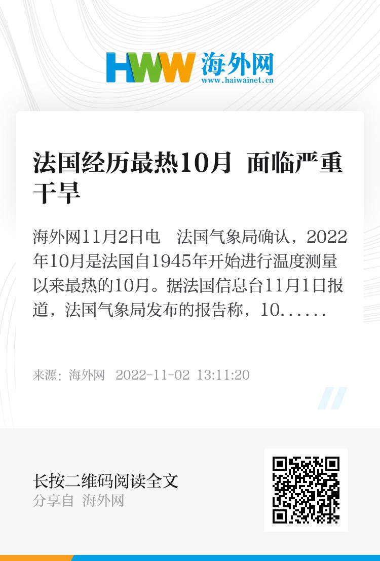 海外网11月2日电 法国气象局确认,2022年10月是法国自1945年开始进行温度测量以来最热的10月。