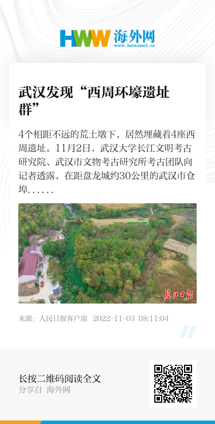 4个相距不远的荒土墩下,居然埋藏着4座西周遗址。11月2日,武汉大学长江文明考古研究院、武汉市文物考古研究所考古团队向记者透露,在距盘龙城约30公里的武汉市仓埠街道五峰村、宝店村、陶岗村、淋江村和井山村,方圆15公里范围内,发现距今3000年的西周环壕遗址群及贵族墓,这在湖北商周考古中属首见。