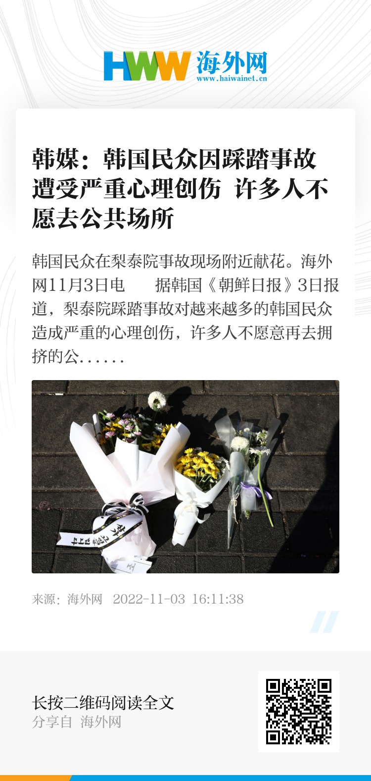 在社交媒体上看到事故图片也会引发一些韩国民众的精神创伤。一名住在京畿道义王市的 28岁职员表示,“我经常去梨泰院,简直不敢相信发生了这种事情,我一直在网上看到事故照片,这让我感到恶心头痛。”