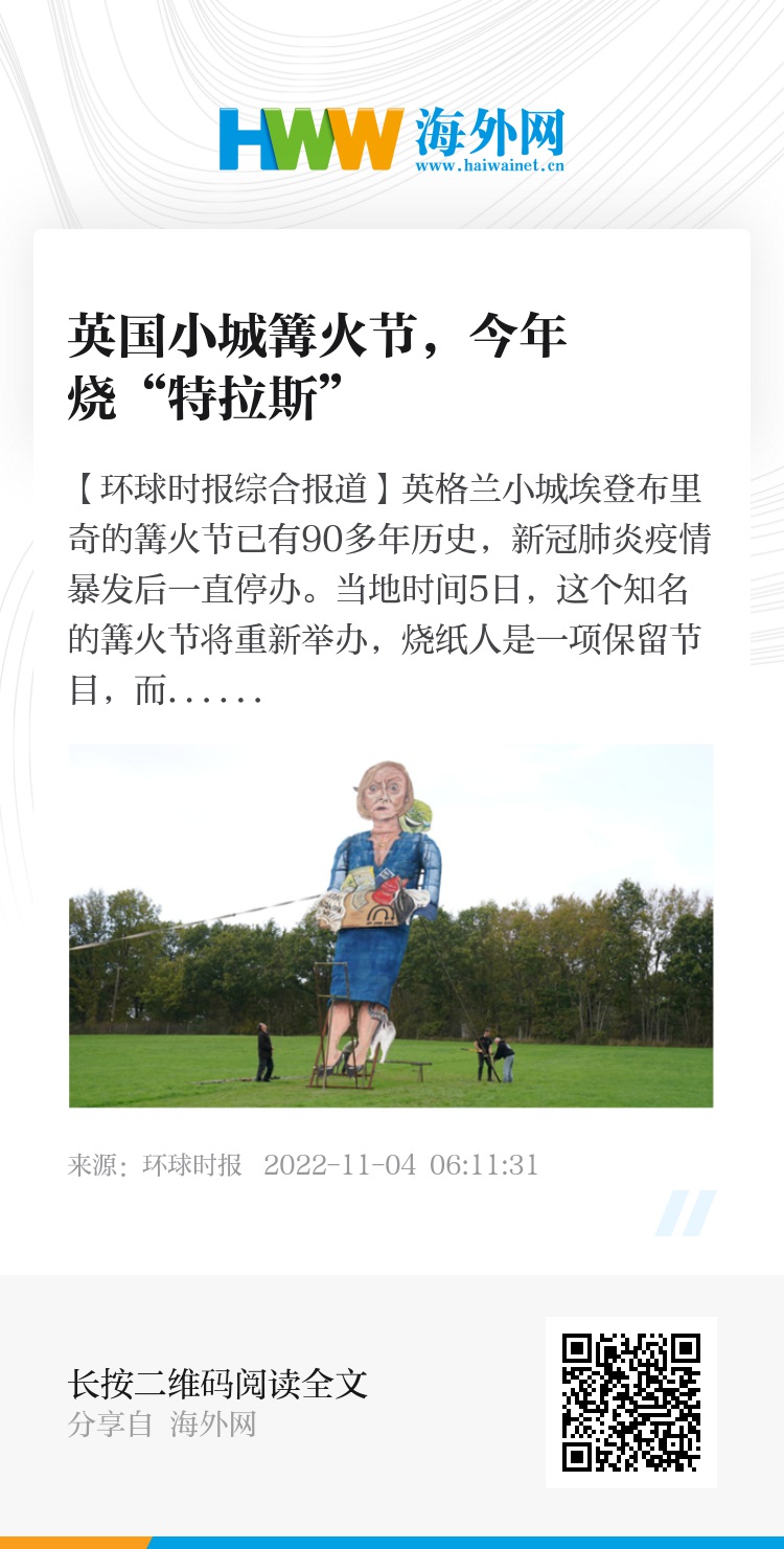 据英国广播公司(BBC)2日报道,活动主办方已准备好高达11米的特拉斯巨型纸人。纸人表情郁闷,双手捧着纸箱子,箱子里装着任期最短首相吉尼斯世界纪录证明、印有“我是斗士、不是逃兵”字样的T恤等。纸人肩头趴着一颗生菜,暗指之前有人嘲讽生菜还没蔫她就下台了。此前,已有不少政客在篝火节“火”过,例如美国前总统特朗普和英国前首相约翰逊。(甄翔)