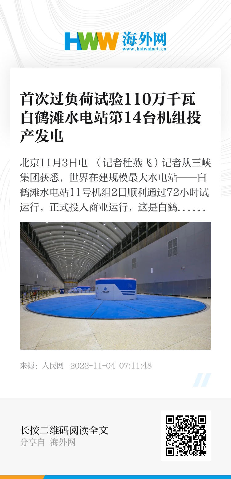 人民网北京11月3日电 (记者杜燕飞)记者从三峡集团获悉,世界在建规模最大水电站——白鹤滩水电站11号机组2日顺利通过72小时试运行,正式投入商业运行,这是白鹤滩水电站第14台投产发电的百万千瓦水轮发电机组。