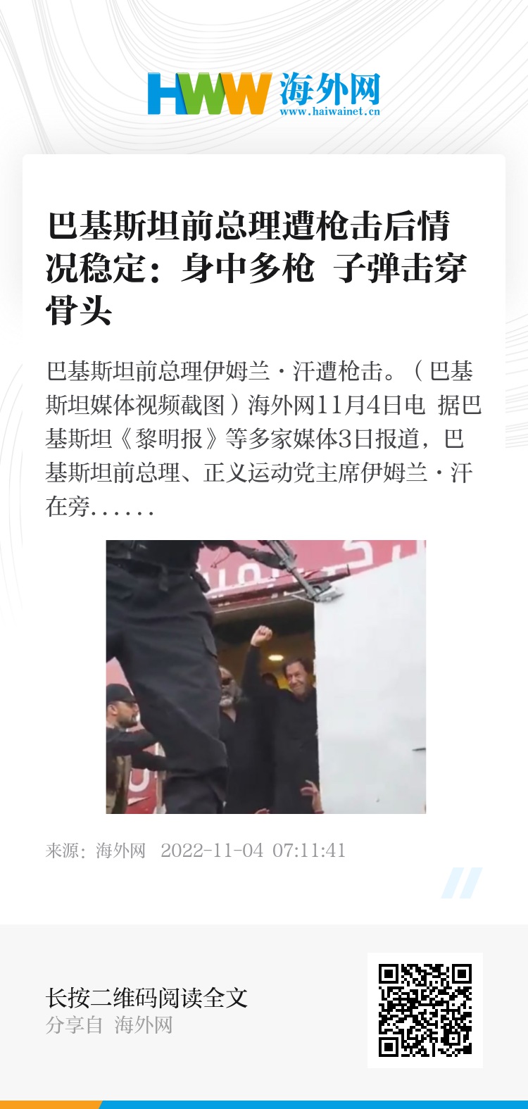 海外网11月4日电 据巴基斯坦《黎明报》等多家媒体3日报道,巴基斯坦前总理、正义运动党主席伊姆兰·汗在旁遮普省举行的游行活动中遭枪击,袭击者已被逮捕。正义运动党称,伊姆兰·汗身中多颗子弹,目前情况稳定。