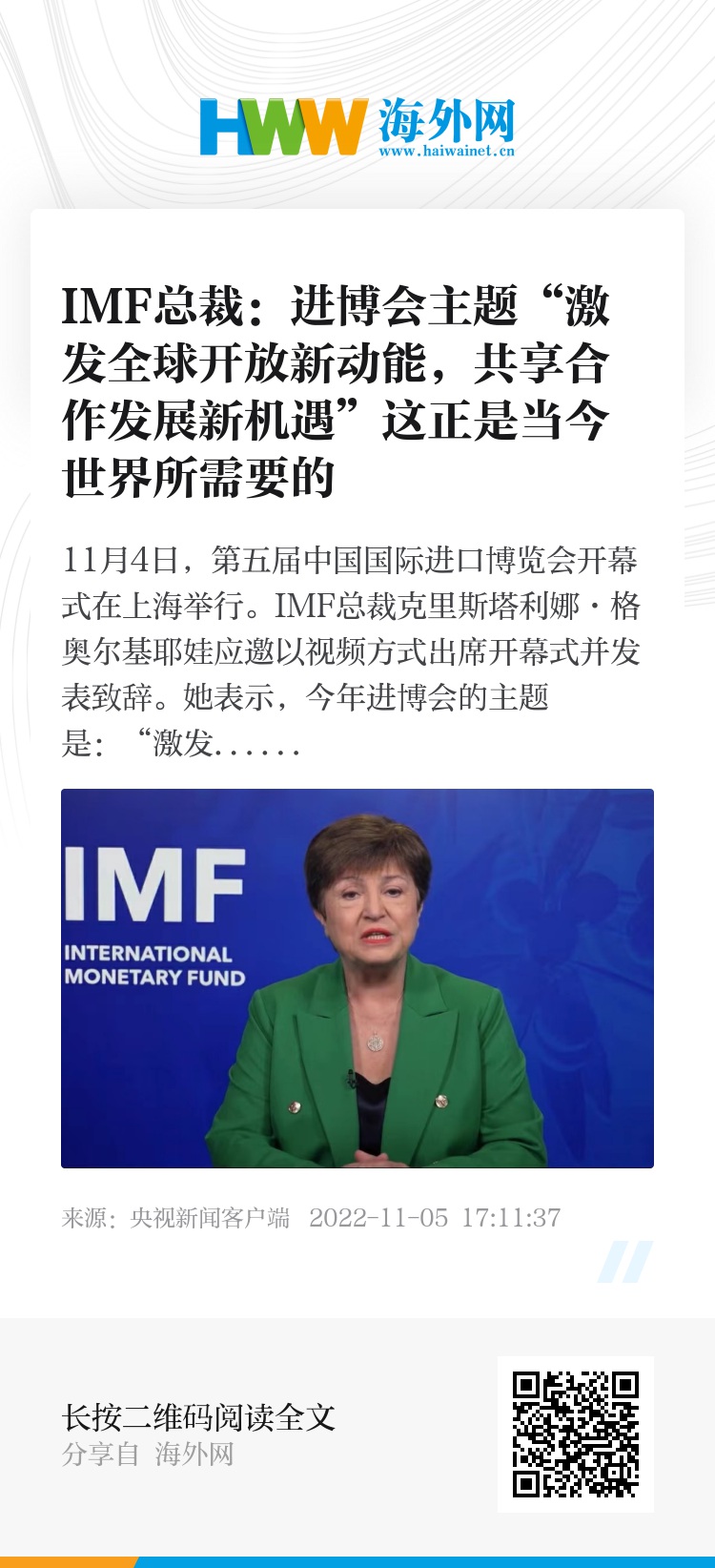 11月4日,第五届中国国际进口博览会开幕式在上海举行。IMF总裁克里斯塔利娜·格奥尔基耶娃应邀以视频方式出席开幕式并发表致辞。
