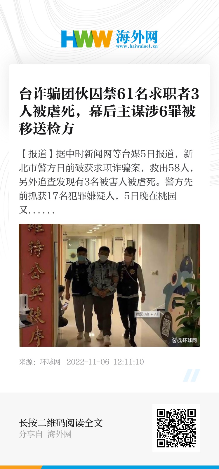 【环球网报道】据中时新闻网等台媒5日报道,新北市警方日前破获求职诈骗案,救出58人,另外追查发现有3名被害人被虐死。警方先前抓获17名犯罪嫌疑人,5日晚在桃园又逮捕3名参与弃尸的嫌疑人。报道称,警方依杀人、组织犯罪、欺诈、洗钱、伤害、妨害自由等6罪,将已被逮捕的幕后主谋陈姓男子移送士林地检署。