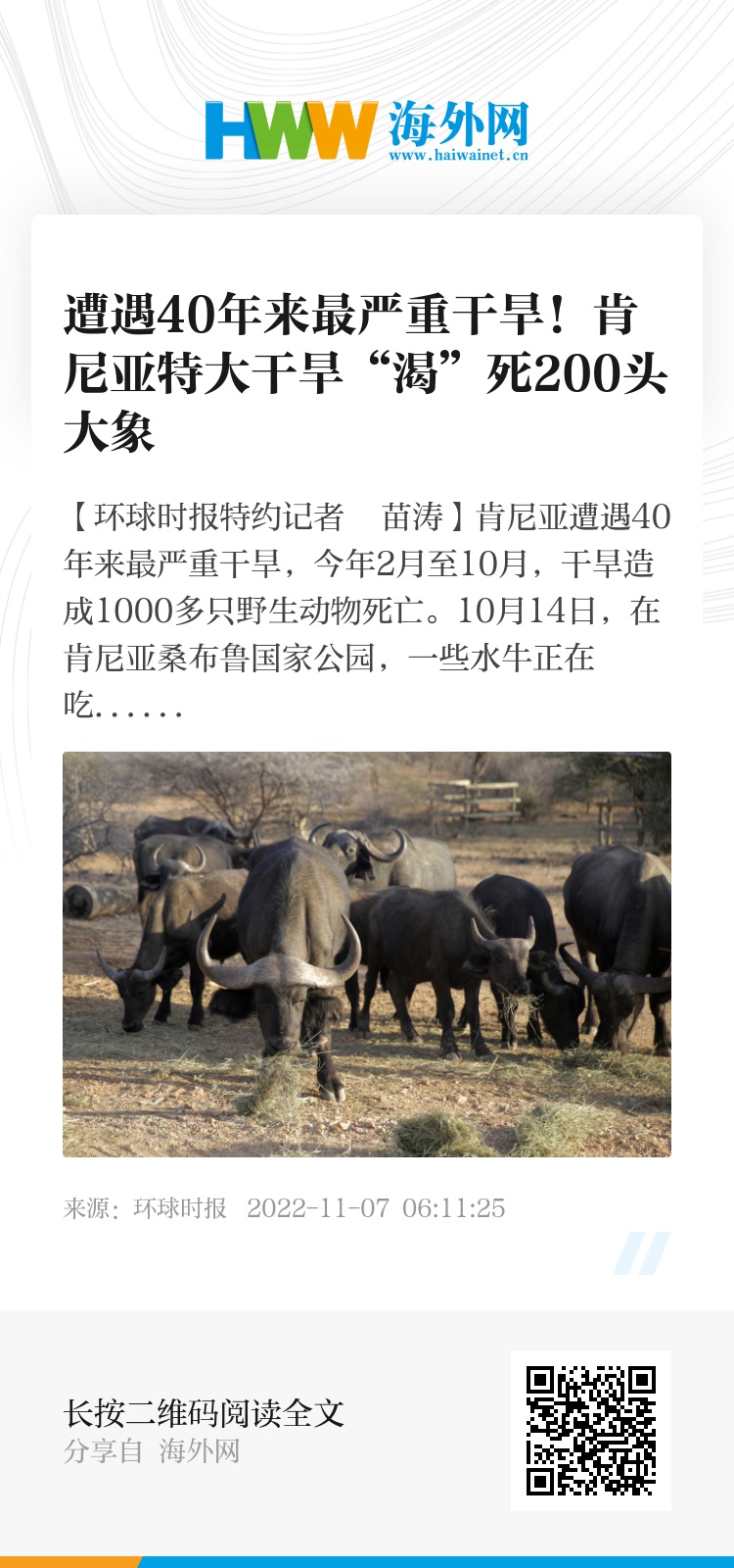 【环球时报特约记者 苗涛】肯尼亚遭遇40年来最严重干旱,今年2月至10月,干旱造成1000多只野生动物死亡。