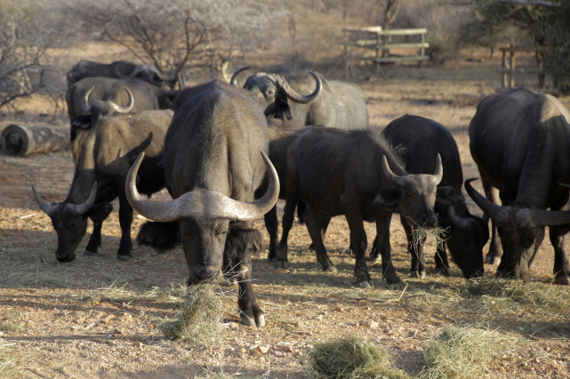 10月14日,在肯尼亚桑布鲁国家公园,一些水牛正在吃投喂的草料。新华社/美联