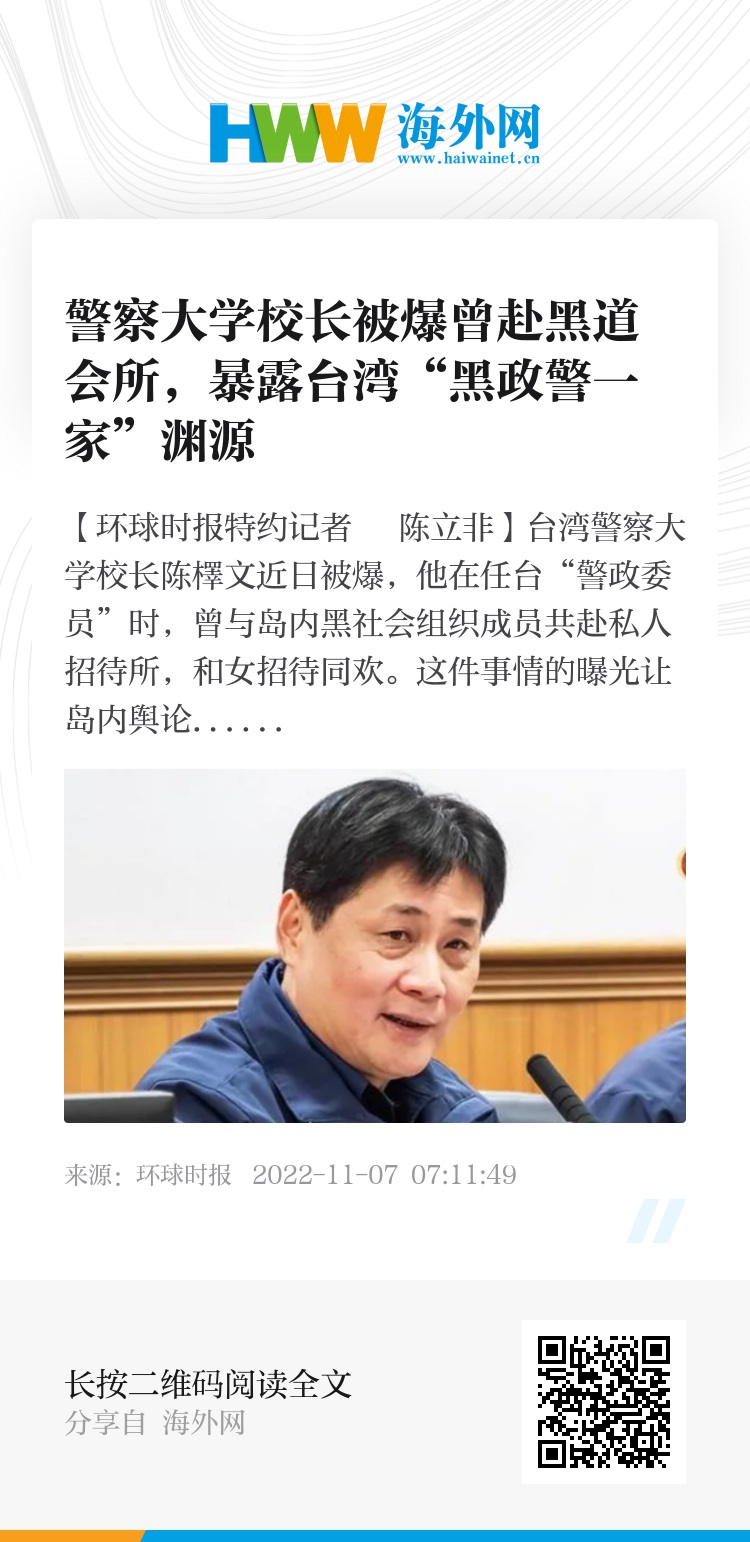 【环球时报特约记者 陈立非】台湾警察大学校长陈檡文近日被爆,他在任台“警政委员”时,曾与岛内黑社会组织成员共赴私人招待所,和女招待同欢。这件事情的曝光让岛内舆论质疑,刚刚才喊出要“终结黑金”的蔡英文,究竟是否真正使出力气整治黑道,也暴露出台湾“警政黑一家”渊源已久。