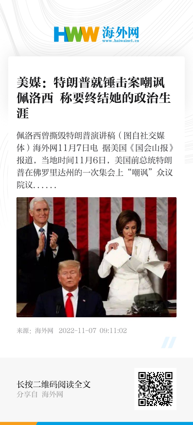 据此前报道,特朗普和佩洛西之间“不对付”由来已久。在特朗普执政时期,他就一直与佩洛西相互质疑对方“精神有问题”。在2020年2月特朗普发表演讲时,佩洛西欲握手被无视后,当场撕毁特朗普演讲稿。今年10月,佩洛西还嘲讽特朗普不敢就美国国会大厦骚乱事件宣誓作证,“我觉得他不够男人,不敢出庭(作证)。”(海外网 杨佳)