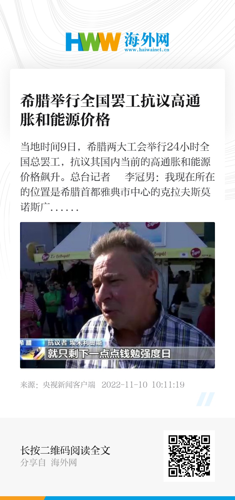 总台记者 李冠男:我现在所在的位置是希腊首都雅典市中心的克拉夫斯莫诺斯广场。大家可以看到,现在我身后已经聚集了很多前来参加示威集会的雅典市民。当地时间11月9日,希腊两大工会组织“希腊全国公职协会”和“希腊全国劳工总会”举行24小时全国总罢工。两大工会表示,当前能源成本飙升,物价大幅上涨,但是工资却停滞不前。工会指责希腊当局没有采取足够的措施应对飙升的能源成本及通货膨胀所带来的影响,给希腊普通民众的生活带来了很大冲击。