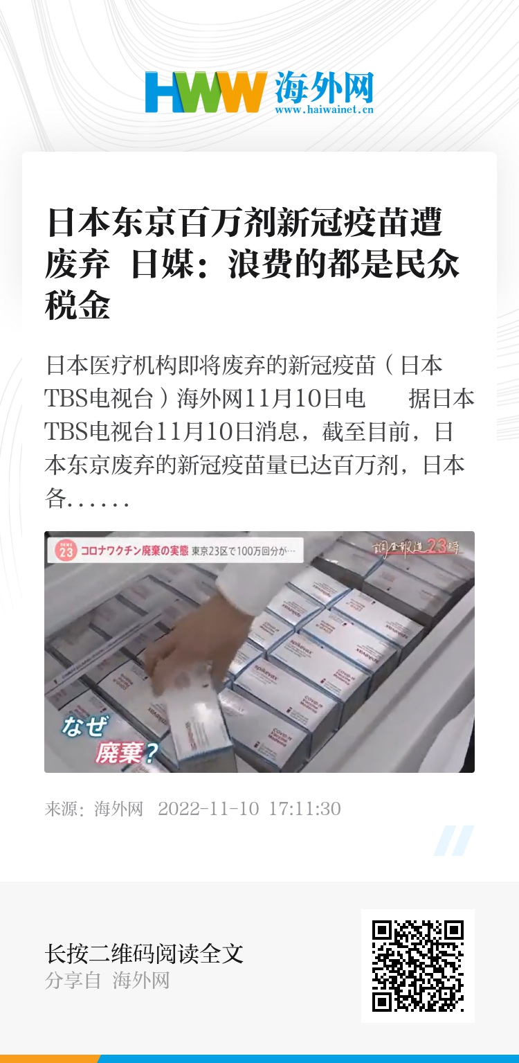 海外网11月10日电 据日本TBS电视台11月10日消息,截至目前,日本东京废弃的新冠疫苗量已达百万剂,日本各地浪费疫苗的情况也频频发生,引发各方质疑。