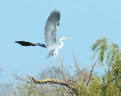 一只苍鹭在安徽省巢湖半岛国家湿地公园内飞翔。新华社记者 郭 晨摄