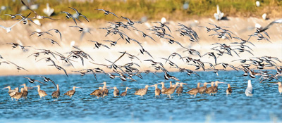 大批黑尾塍鹬在江苏省东台条子泥湿地栖息地飞翔。孙家录摄(人民图片)