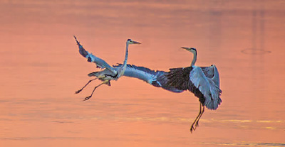 在山东省荣成市成山镇一河道,两只苍鹭在空中打斗。王福东摄(人民图片)