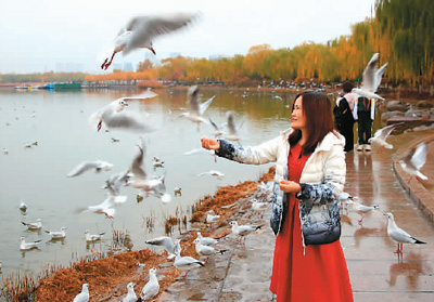 日前,一场秋雨过后,塞上湖城银川市烟雨蒙蒙、候鸟纷飞,市民纷纷来到海宝公园观赏来这里迁徙觅食的红嘴鸥。