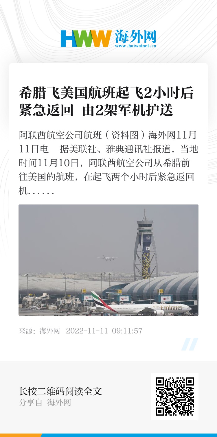 海外网11月11日电 据美联社、雅典通讯社报道,当地时间11月10日,阿联酋航空公司从希腊前往美国的航班,在起飞两个小时后紧急返回机场。