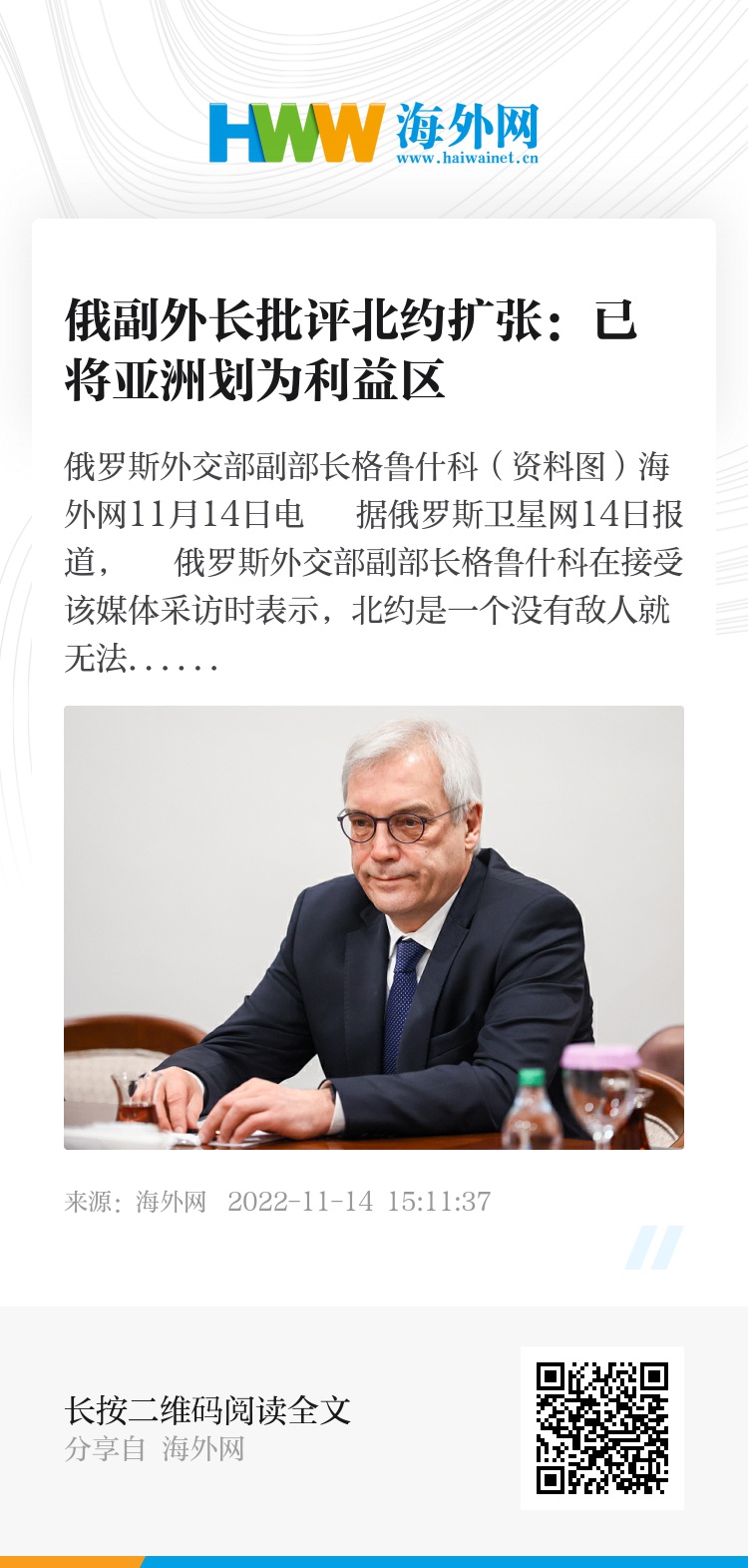海外网11月14日电 据俄罗斯卫星网14日报道, 俄罗斯外交部副部长格鲁什科在接受该媒体采访时表示,北约是一个没有敌人就无法存在的组织,它正在向新的地区扩张,已经将亚洲划为其利益区。