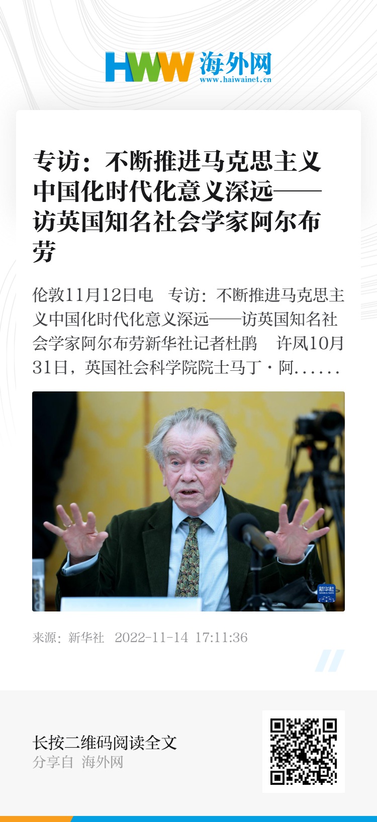 新华社伦敦11月12日电 专访:不断推进马克思主义中国化时代化意义深远——访英国知名社会学家阿尔布劳