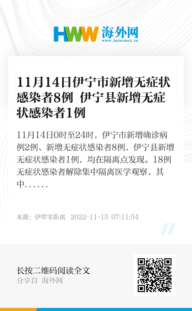 11月14日0时至24时,伊宁市新增确诊病例2例、新增无症状感染者8例,伊宁县新增无症状感染者1例,均在隔离点发现。