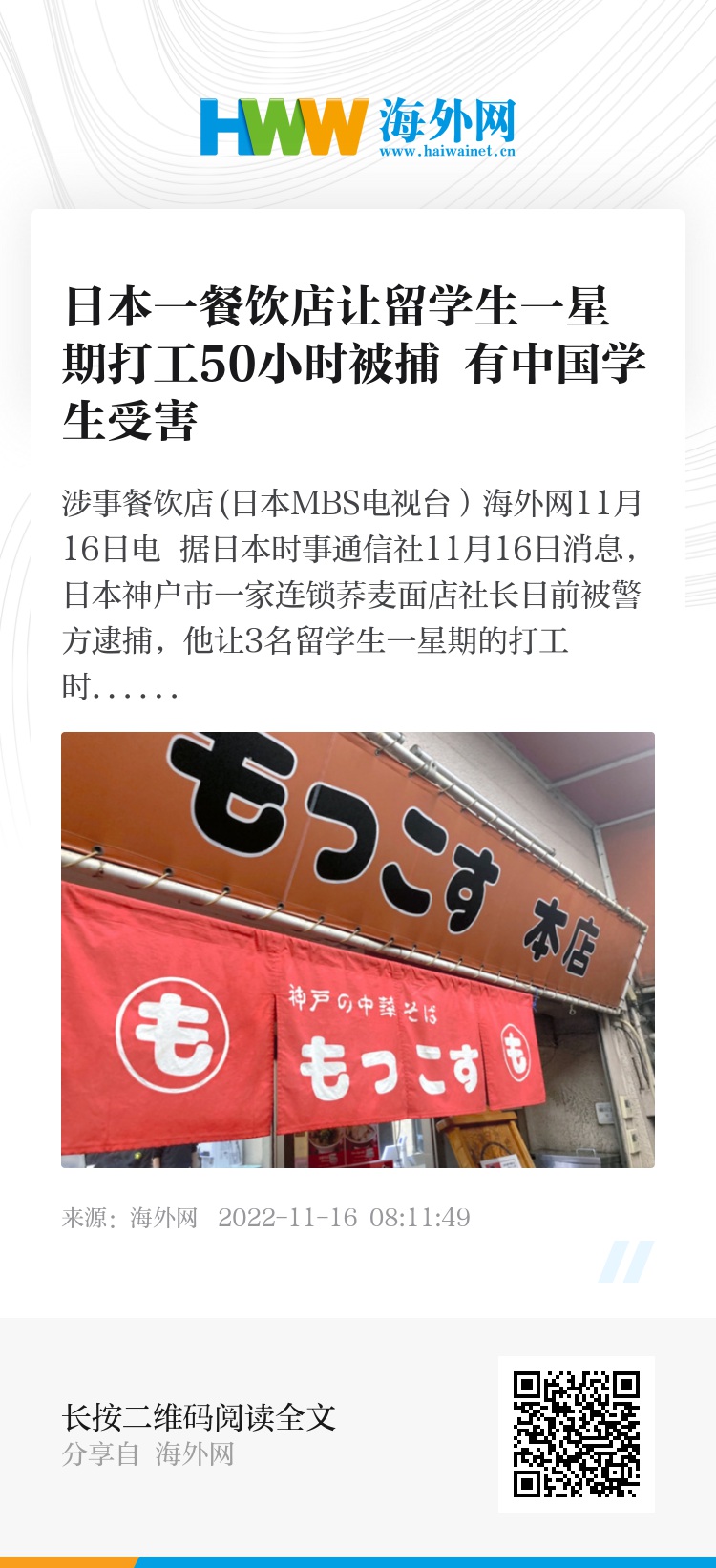 海外网11月16日电 据日本时事通信社11月16日消息,日本神户市一家连锁荞麦面店社长日前被警方逮捕,他让3名留学生一星期的打工时间超过法定时间,受害学生包括中国人。