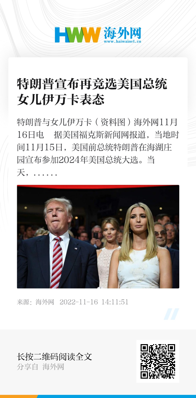 海外网11月16日电 据美国福克斯新闻网报道,当地时间11月15日,美国前总统特朗普在海湖庄园宣布参加2024年美国总统大选。当天,特朗普的女儿伊万卡就此事表态说,自己不打算参与政治了。