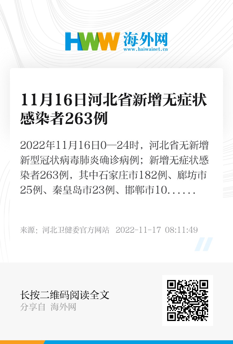 2022年11月16日0—24时,河北省无新增新型冠状病毒肺炎确诊病例;新增无症状感染者263例,其中石家庄市182例、廊坊市25例、秦皇岛市23例、邯郸市10例、张家口市7例、沧州市7例、邢台市5例、保定市2例、衡水市2例。无症状感染者解除医学观察281例。