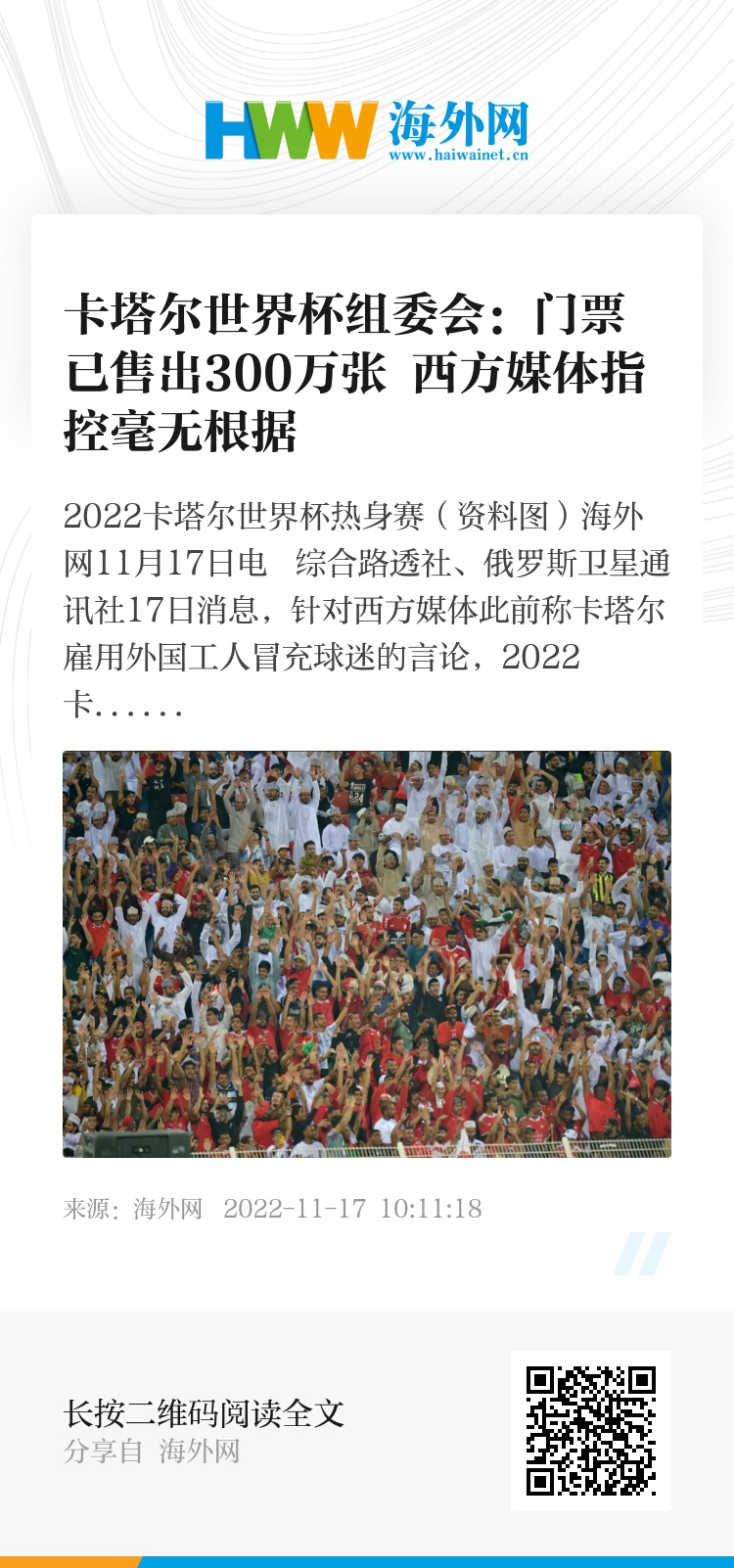 海外网11月17日电 综合路透社、俄罗斯卫星通讯社17日消息,针对西方媒体此前称卡塔尔雇用外国工人冒充球迷的言论,2022卡塔尔世界杯组委会首席执行官纳赛尔·阿勒哈特表示,目前已售出了300多万张卡塔尔世界杯门票,西方媒体的指控毫无根据。