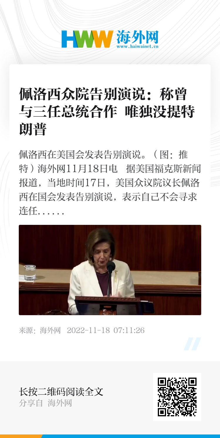 海外网11月18日电 据美国福克斯新闻报道,当地时间17日,美国众议院议长佩洛西在国会发表告别演说,表示自己不会寻求连任民主党领导职位,在回顾与历任总统合作的经历时,唯独没有提及特朗普。