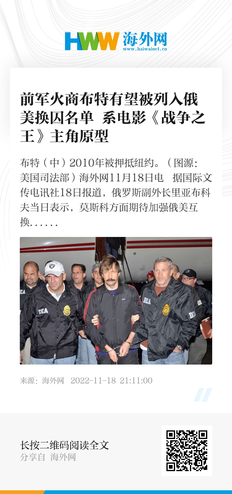 海外网11月18日电 据国际文传电讯社18日报道,俄罗斯副外长里亚布科夫当日表示,莫斯科方面期待加强俄美互换囚犯的前景,并希望能够将被美国逮捕的前军火商维克托·布特交换回来。