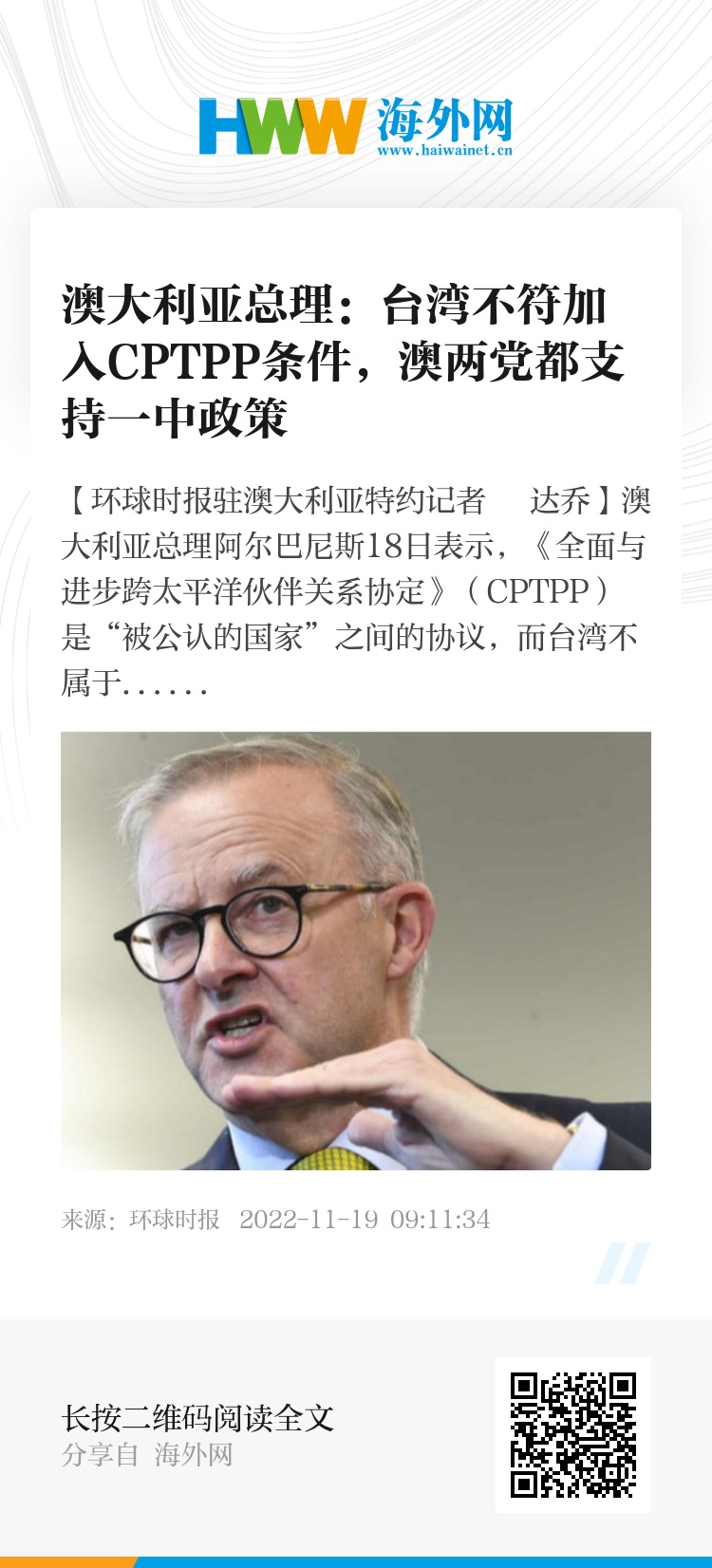 台湾当局一直在谋求加入CPTPP,并于去年9月递交申请。在阿尔巴尼斯发表上述表态后,台外事部门发言人欧江安18日批评阿尔巴尼斯的表态“与CPTPP相关规定相悖”,当天晚些时候又宣称“收到澳方澄清”。