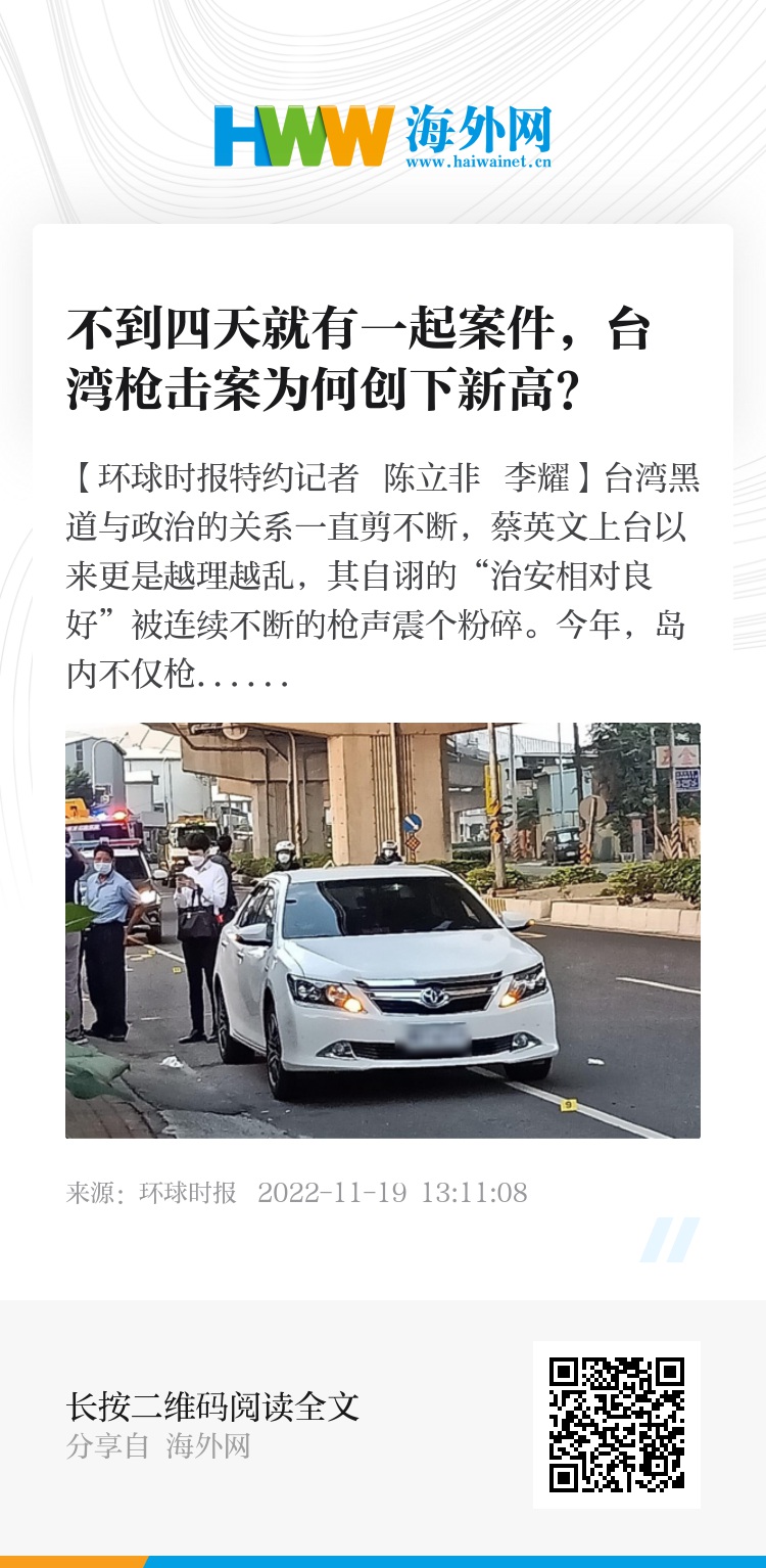 事实上这几年,台湾的枪击案就没消停。2020年8月,绰号“馆长”的岛内网红陈之汉在台北林口遭到枪击,枪手连开3枪,他身中两枪,右手与右大腿中弹流血倒地。2021年2月,台南市蔡姓男子近距离枪杀黑帮大佬陈某。此外,涉嫌绑架嘉义县柯姓富商的57岁李某3月2日逃往高雄时,遭警方拦截围捕,双方爆发枪战,最后李某中弹身亡。