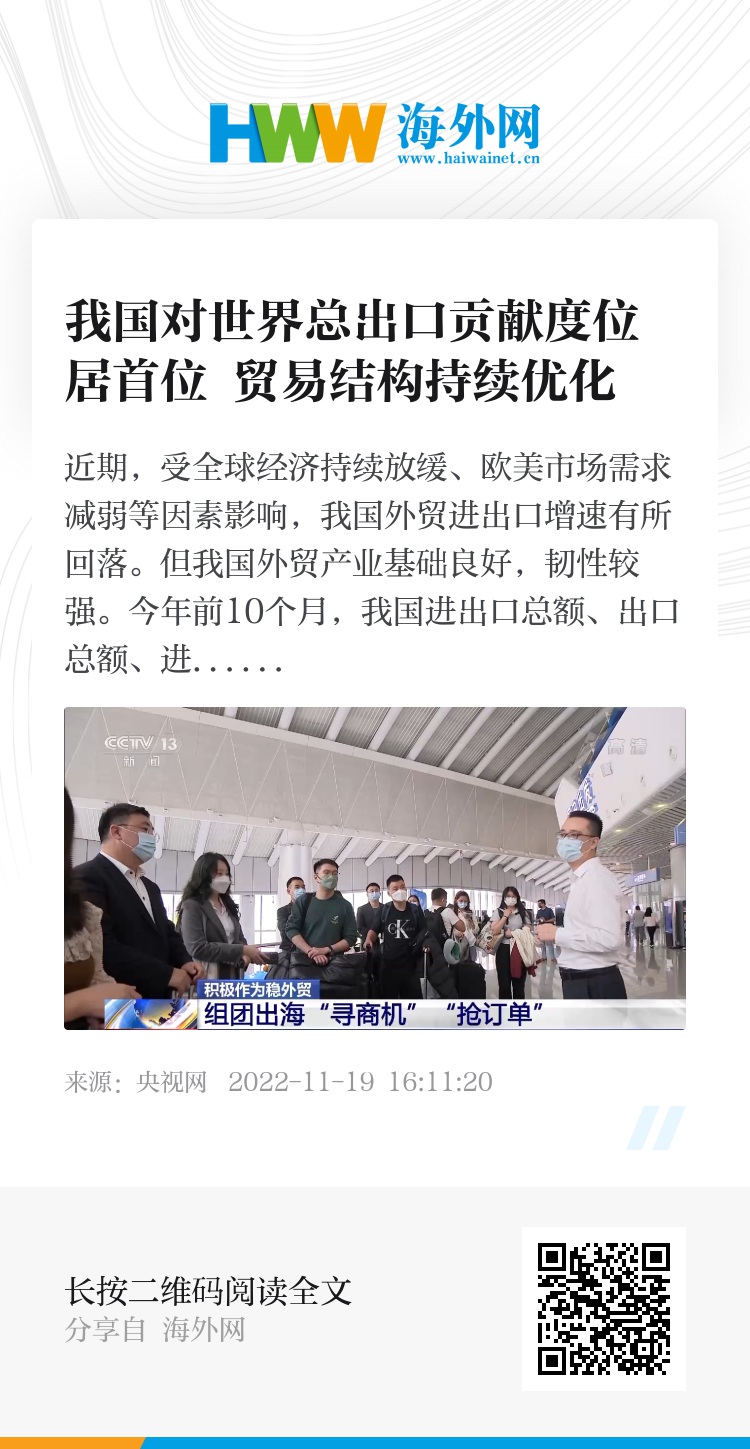 商务部国际贸易经济合作研究院对外贸易研究所所长 梁明:我们这个增量主要是机电产品,我们出口额的增长大部分全是由价格贡献的,也就是我们出口产品的附加值,出口的质量和效益也得到了进一步提升。从目前已经公布贸易数据的国家来看,中国出口对世界总出口的贡献度是始终排在第一位的。