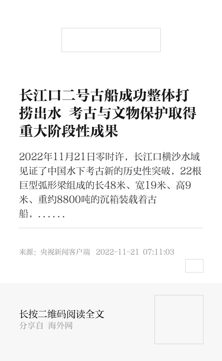 2022年11月21日零时许,长江口横沙水域见证了中国水下考古新的历史性突破,22根巨型弧形梁组成的长48米、宽19米、高9米、重约8800吨的沉箱装载着古船,经过4个多小时的水下持续提升后,在打捞工程船“奋力轮”中部月池缓缓露出水面,古船桅杆清晰可见,古船时隔150多年重见天日。